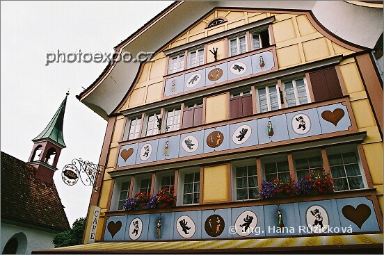 "Perníková" fasáda Café Flade na Hauptgasse v idylickém městečku Appenzell. Švýcarsko