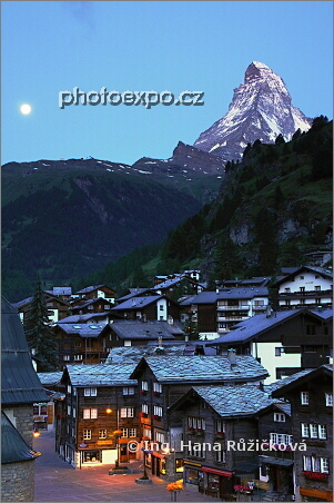 Matterhorn, měsíc a ranní Zermatt. Wallis, Švýcarsko.