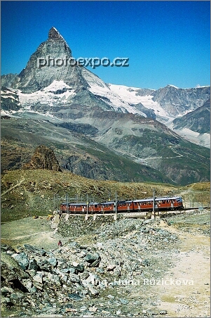 Velký Matterhorn a malá zubačka vozící turisty ze Zermattu na Gornergrat. Wallis, Švýcarsko.