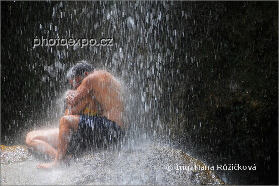 Poslední fotografie ze série čtyř snímků zamilovaného páru pod vodopádem Salto del Arco Iris nedaleko Soroy. Dvojice sedí stále na jednom místě, ale vodopád se horizontálně posunuje zprava doleva... Kuba