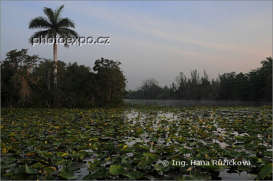 Obklopeni tísíci lekníny jsme si na malé loďce užívali fantastickou ranní atmosféru s jemným oparem vznášejícím se nad hladinou Laguny del Tesoro. Zapata, Kuba.