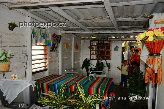 Tak tenhle domek mě nadchnul! Na snímku je interiér průchozího obývacího pokoje tohoto domku, kde jsme po dvě noci bydleli načerno, tedy v nelegální "casa particulares" (legální tu žádné nebyly) u Playa Bailén. Dům byl stlučen z prken, mezi kterými notně profukovalo škvírami, jež zároveň nechtěně poskytovaly i dostatek světla a významně tak sekundovaly oknům či spíše dírám vyplněným dřevěnými - a pokud fungovaly - nakláněcími žaluziemi. Střechu domu tvořily palmové listy položené na dřevěné kostře a celý prostor domu byl rozdělen na dvě ložnice, příslušenství (pokud umyvadlo, ze kterého většinou nic neteklo, zrezivělou hlavu sprchy na dlouhé zrezivělé tyči s jednou pákou, ze které také většinou nic neteklo a špinavou keramickou záchodovu mísu, která většinou nesplachovala, lze takto luxusně označit) a tento průchozí obývak a to tenkými příčkami dosahujícími asi tak do poloviny výšky domu. Prostor nad "luxusní částí obýváku" byl navíc ve výšce konců příček překryt vlnitým plechem. Platili jsme 20 CUC, tedy necelých 400 Kč za noc pro dohromady 4 osoby :=) No neber to! ...A ta "domácí" atmosféra. Jen majitelé se chudáci na ty dvě noci museli vystěhovat a spát na dvorku. Prostě fascinující Kuba!